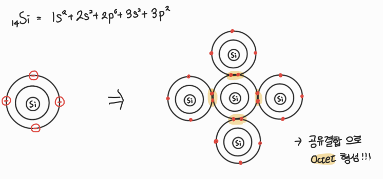 <5족의> 실리콘 원자들의 최외각 전자(-) 2개가 서로 결합하여