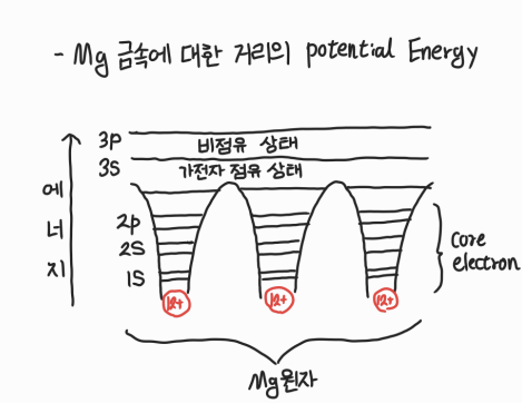 따라서 각 원자에 속하는 전자(-) 는 모든 원자에 공유하면서 결정내에서 자유로이 이동이