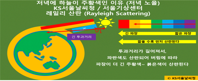 즉 노을이 생긴다. 낮에는 태양이 우리 머리 위에 있어서 투과거리가 짧은 반면, 반대로 저녁시간이 되면 태의